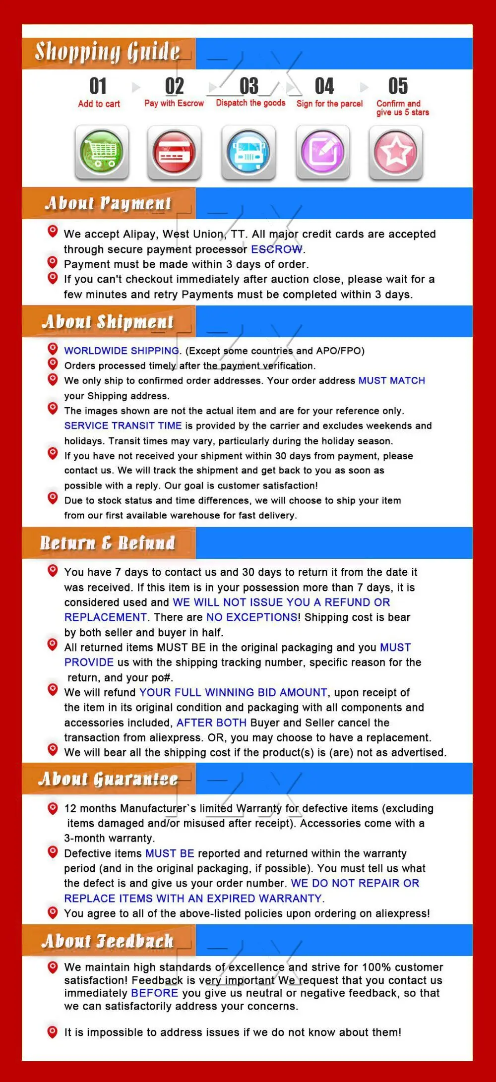 • If you did not receive the product within the guaranteed time( 45 days not including 2-5 day processing) you can request a refund or a reshipment.