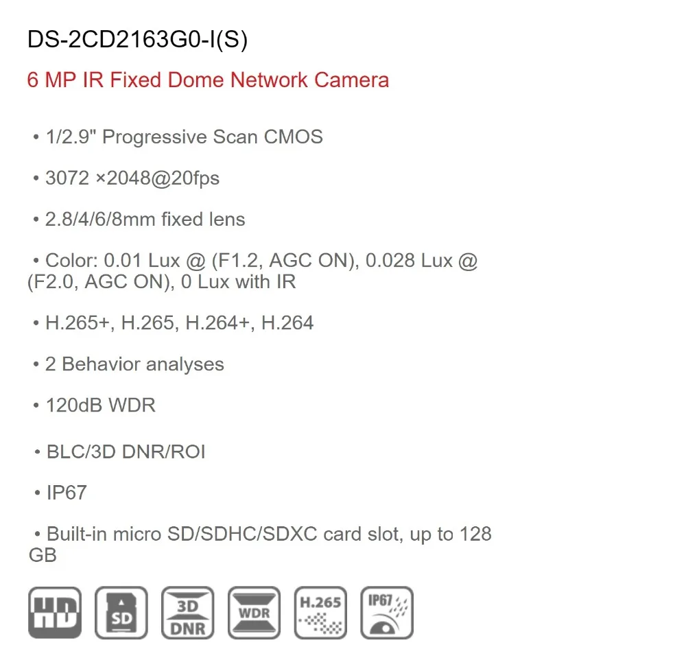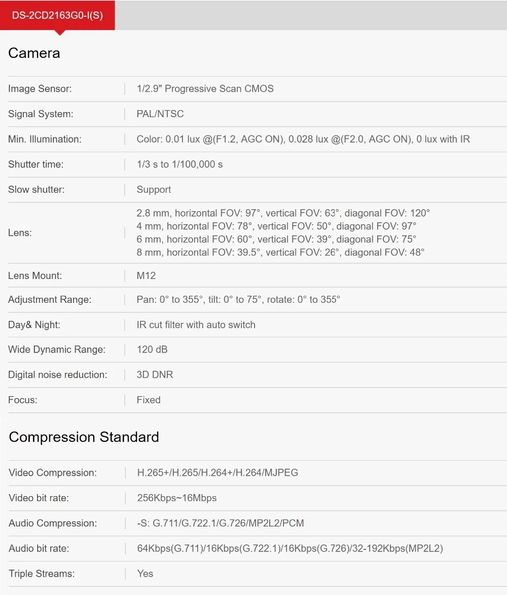 • Dome Camera model DS-2CD2163G0-I , default 2.8mm lens